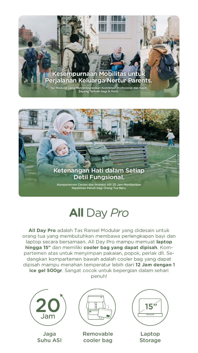 All Day Pro adalah Tas Ransel Modular yang didesain untuk orang tua yang membutuhkan membawa perlengkapan bayi dan laptop secara bersamaan. All Day Pro mampu memuat laptop hingga 15" dan memiliki cooler bag yang dapat dipisah. Kompartemen atas untuk menyimpan pakaian, popok, perlak dll. Sedangkan kompartemen bawah adalah cooler bag yang dapat dipisah mampu menahan temperatur lebih dari 12 Jam dengan 1 ice gel 500gr. Sangat cocok untuk bepergian dalam sehari penuh!