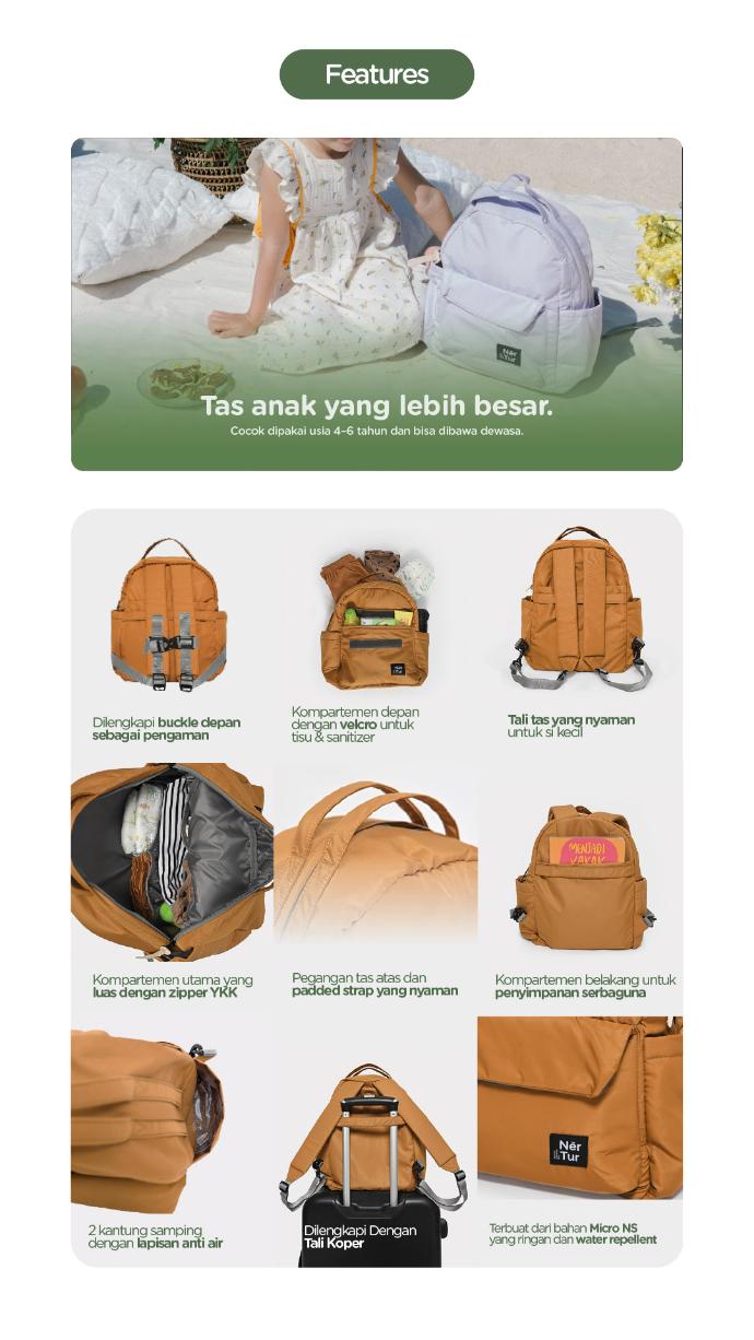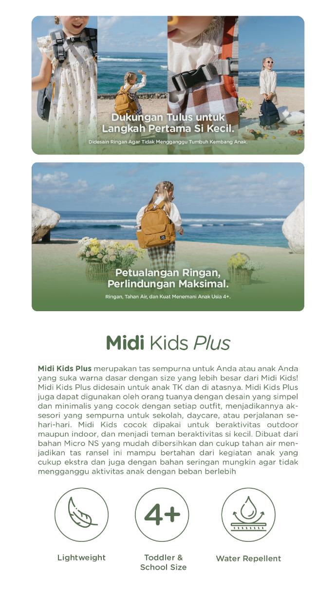 Midi Kids Plus merupakan tas sempurna untuk Anda atau anak Anda yang suka warna dasar dengan size yang lebih besar dari Midi Kids! Midi Kids Plus didesain untuk anak TK dan di atasnya. Midi Kids Plus juga dapat digunakan oleh orang tuanya dengan desain yang simpel dan minimalis yang cocok dengan setiap outfit, menjadikannya aksesori yang sempurna untuk sekolah, daycare, atau perjalanan sehari-hari. Midi Kids cocok dipakai untuk beraktivitas outdoor maupun indoor, dan menjadi teman beraktivitas si kecil. Dibuat dari bahan Micro NS yang mudah dibersihkan dan cukup tahan air menjadikan tas ransel ini mampu bertahan dari kegiatan anak yang cukup ekstra dan juga dengan bahan seringan mungkin agar tidak mengganggu aktivitas anak dengan beban berlebih.
