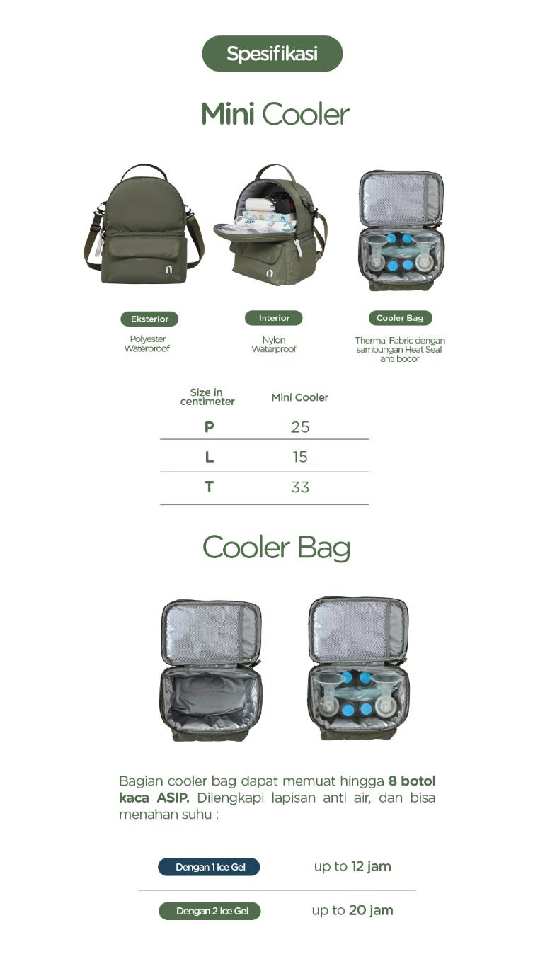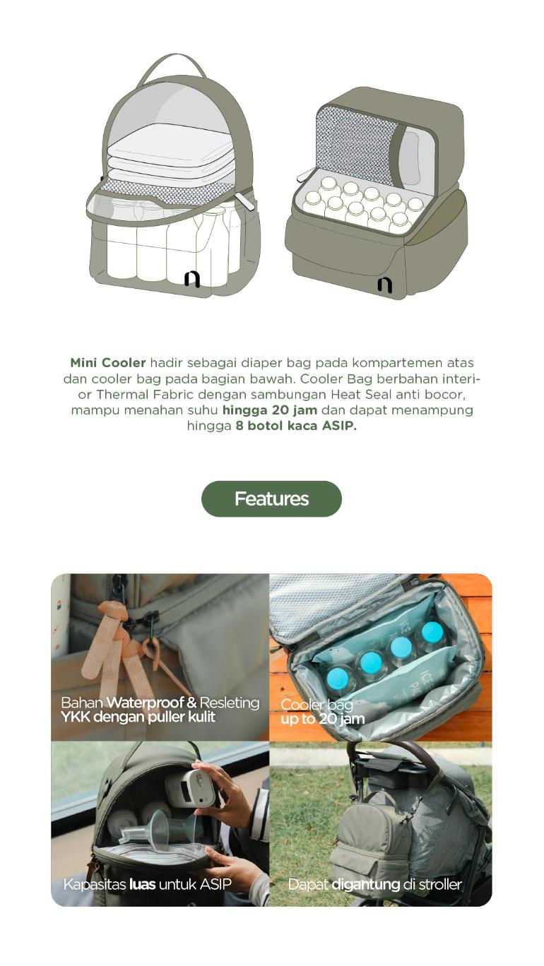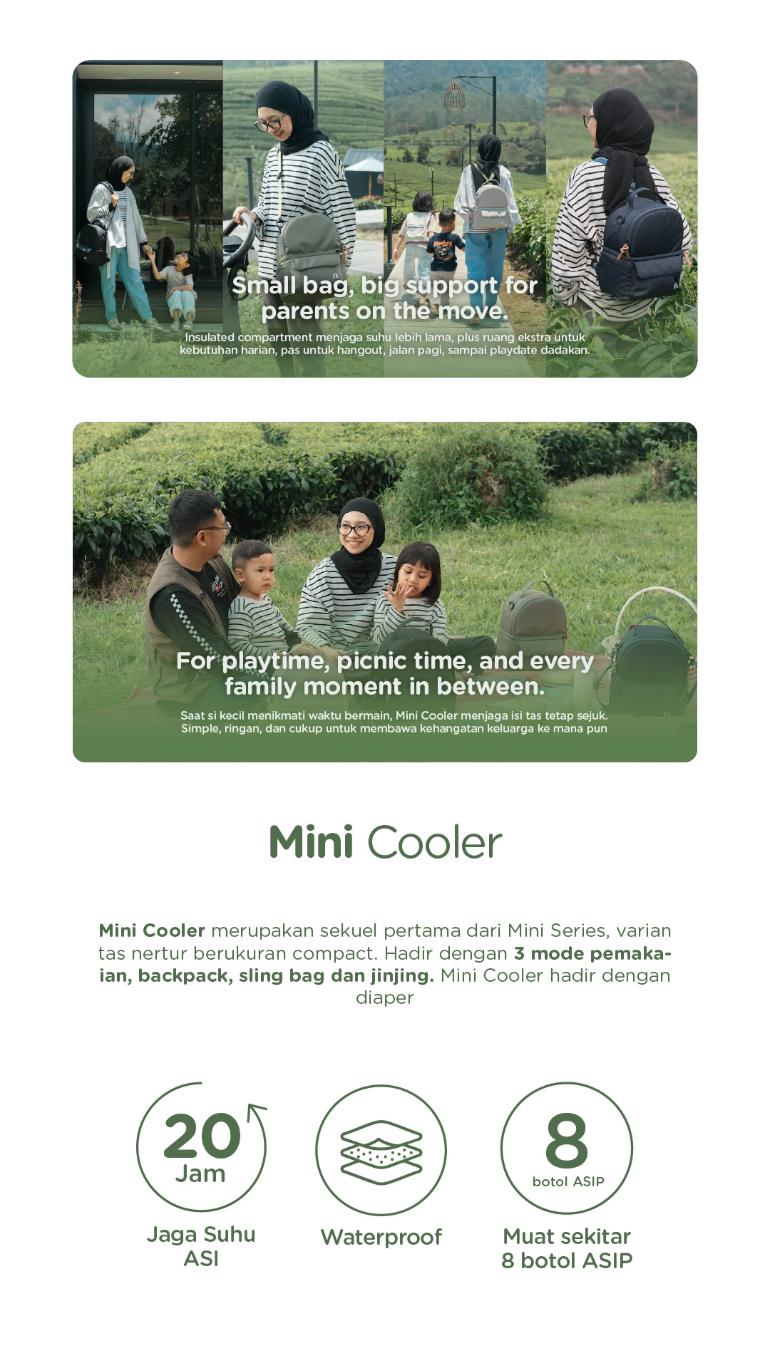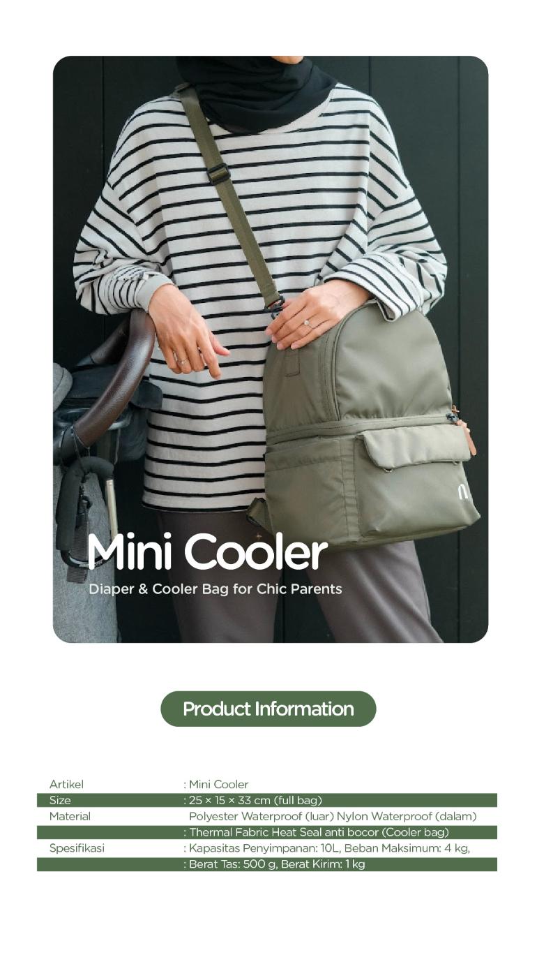 Mini Cooler merupakan sekuel pertama dari Mini Series, varian tas nertur berukuran compact. Mini Cooler merupakan Cooler Bag berukuran kompak 10L dengan 3 mode pemakaian, backpack sling bag dan jinjing. Mini Cooler hadir dengan diaper pada kompartemen atas dan cooler bag pada bagian bawah. Mini Cooler menjadi pilihan untuk NerTur Parents yang membutuhkan tas kompak berukuran kecil dengan fleksibilitas tinggi untuk menemani perjalanan parenting kamu