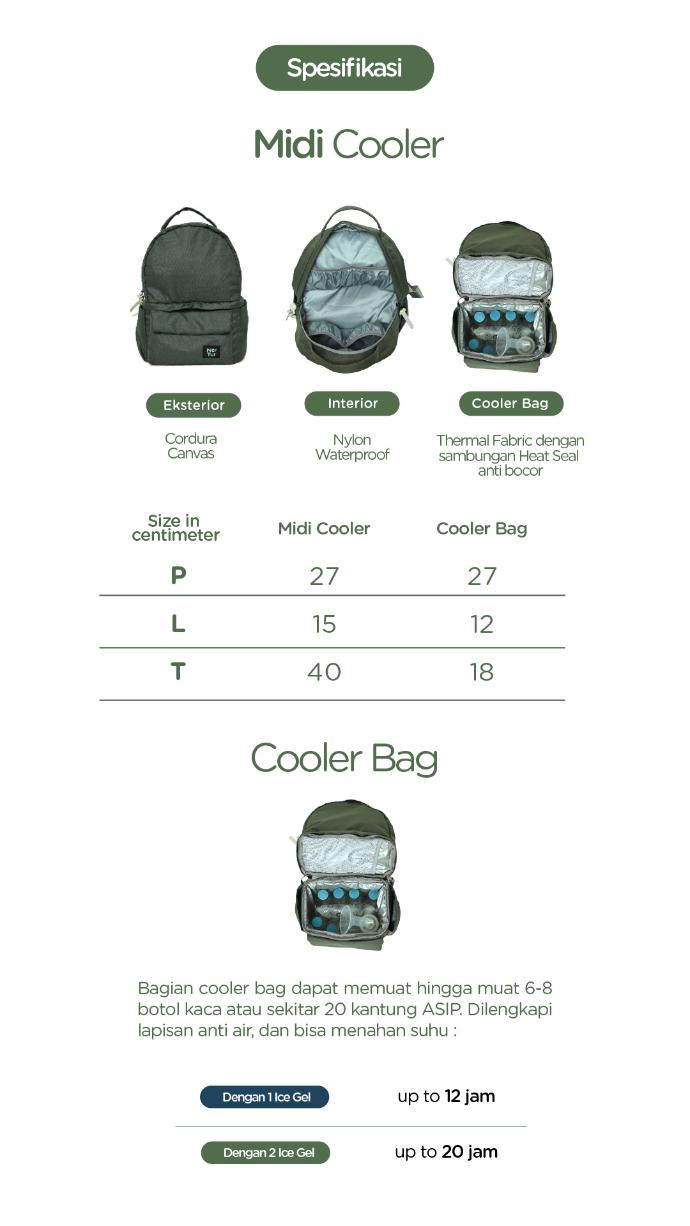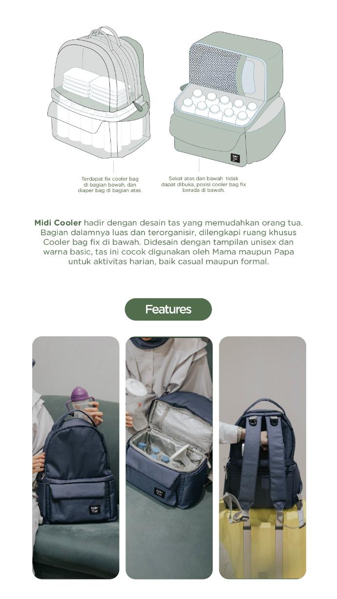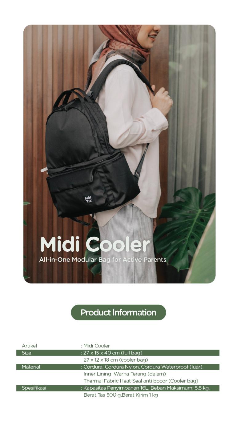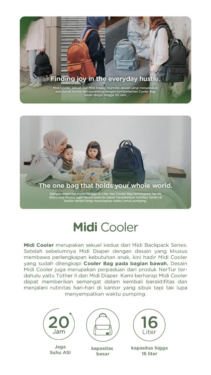 Midi Cooler merupakan sekuel kedua dari Midi Backpack Series. Setelah sebelumnya Midi Diaper dengan desain yang khusus membawa perlengkapan kebutuhan anak, kini hadir Midi Cooler yang sudah dilengkapi Cooler Bag pada bagian bawah. Desain Midi Cooler juga merupakan perpaduan dari produk NerTur terdahulu yaitu Tother II dan Midi Diaper. Kami berharap Midi Cooler dapat memberikan semangat dalam kembali beraktifitas dan menjalani rutinitas hari-hari di kantor yang sibuk tapi tak lupa menyempatkan waktu pumping.