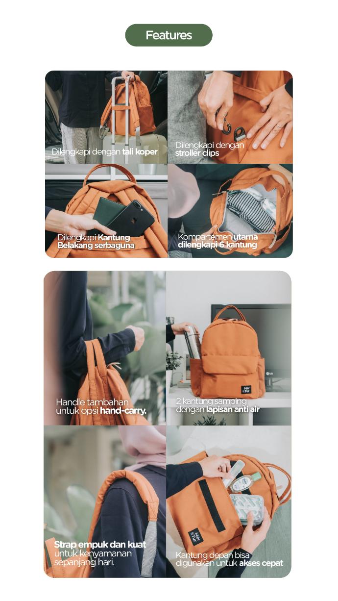 Didesain dengan banyak kantung di luar agar akses cepat saat mengambil barang-barang penting seperti tisu basah/ kering, botol minum, buku medis anak, handphone ataupun mengambil dompet terutama saat bepergian hanya berdua dengan anak. Desain dengan 7 warna basic yang cocok dengan segala jenis outfit baik casual sampai formal