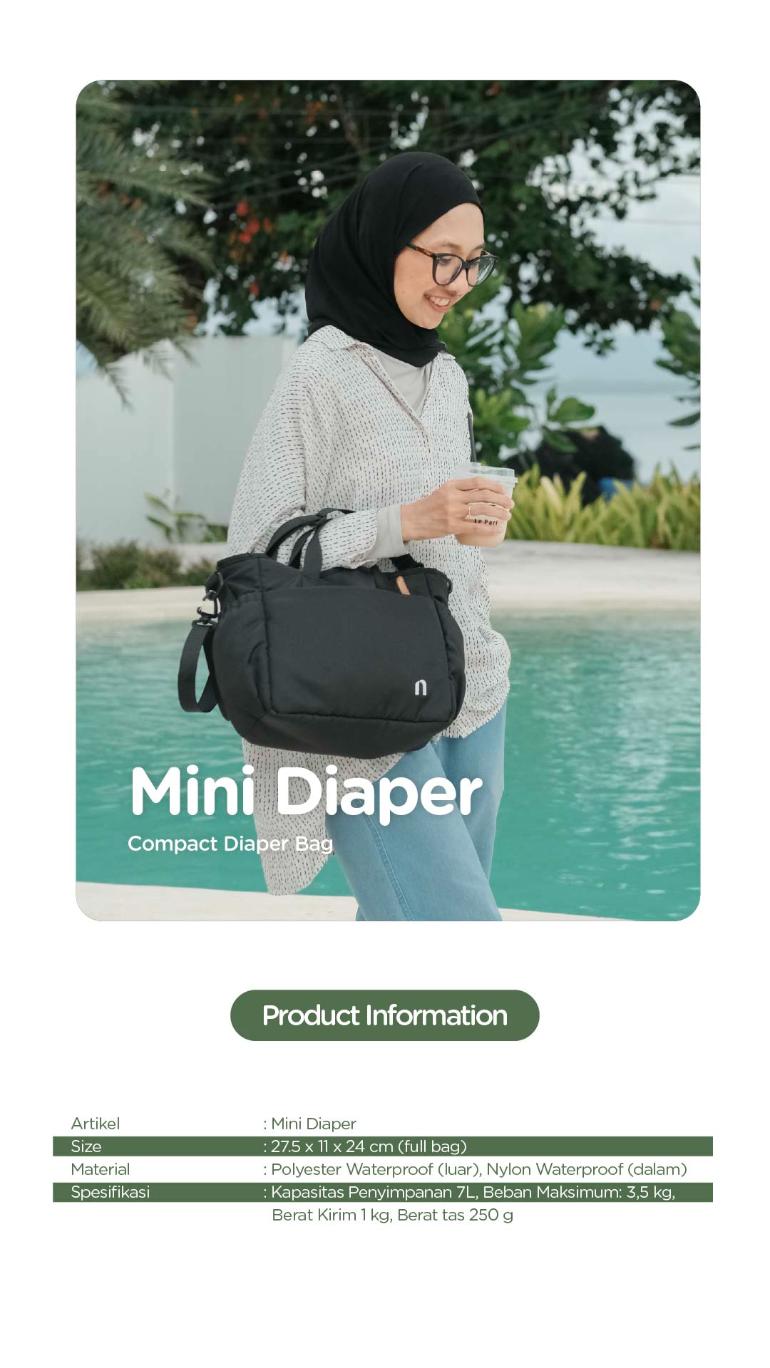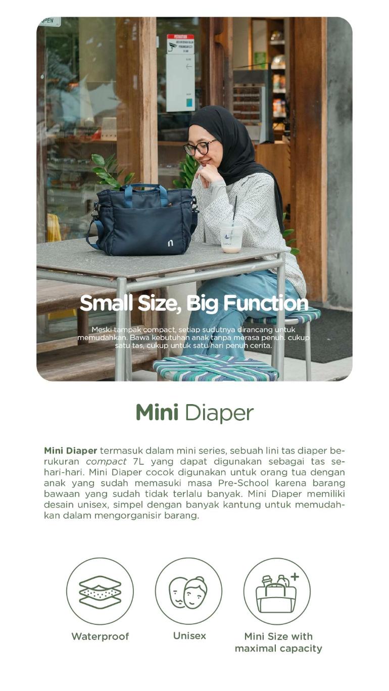 Mini Diaper termasuk dalam mini series, sebuah lini tas diaper berukuran kompak 7L yang dapat digunakan sebagai tas sehari-hari. Mini Diaper cocok digunakan untuk orang tua dengan anak yang sudah memasuki masa Pre-School karena barang bawaan yang sudah tidak terlalu banyak. Mini Diaper memiliki desain unisex, simpel dengan banyak kantung untuk memudahkan dalam mengorganisir barang.